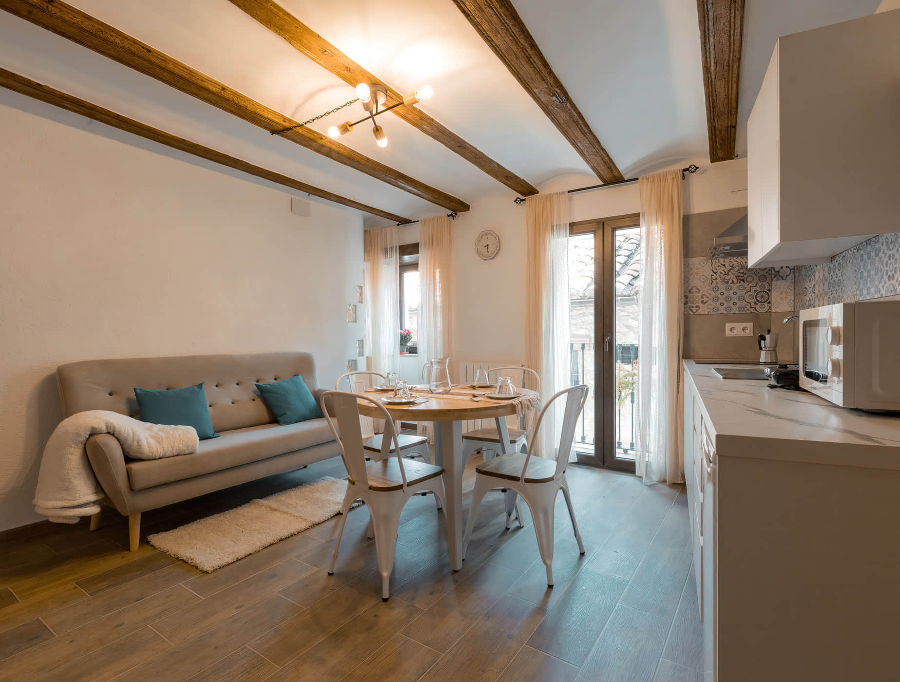 Amplio salón con cocina moderna y decoración acogedora